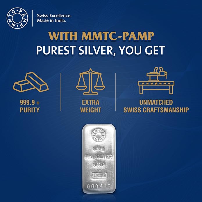 MMTC-PAMP silver cast bars come with 999 purity and we assure positive weight tolerance on each of our minted products. This is an MMTC-PAMP guarantee that every minted product will offer more than the listed weight, ensuring you always get the best value for your money. The rectangular silver cast is beautifully designed, and it can be presented as a token of blessings to someone special or purchased as a safe investment. Crafted using world-class refining technology from our partner PAMP, every MMTC-PAMP Silver cast bar is encased in an elegant Blue buttoned box making it ideal for gifting. As an investment, pure silver is considered as a safe option by most financial experts across the globe. Our silver cast bar is precisely minted with decorative details and comes with its own certificate. The global standard for the highest purities of both gold and silver products is designated as 999 fine. MMTC-PAMP products are made using the world’s most state-of-the-art Swiss technology that gives you guaranteed quality.