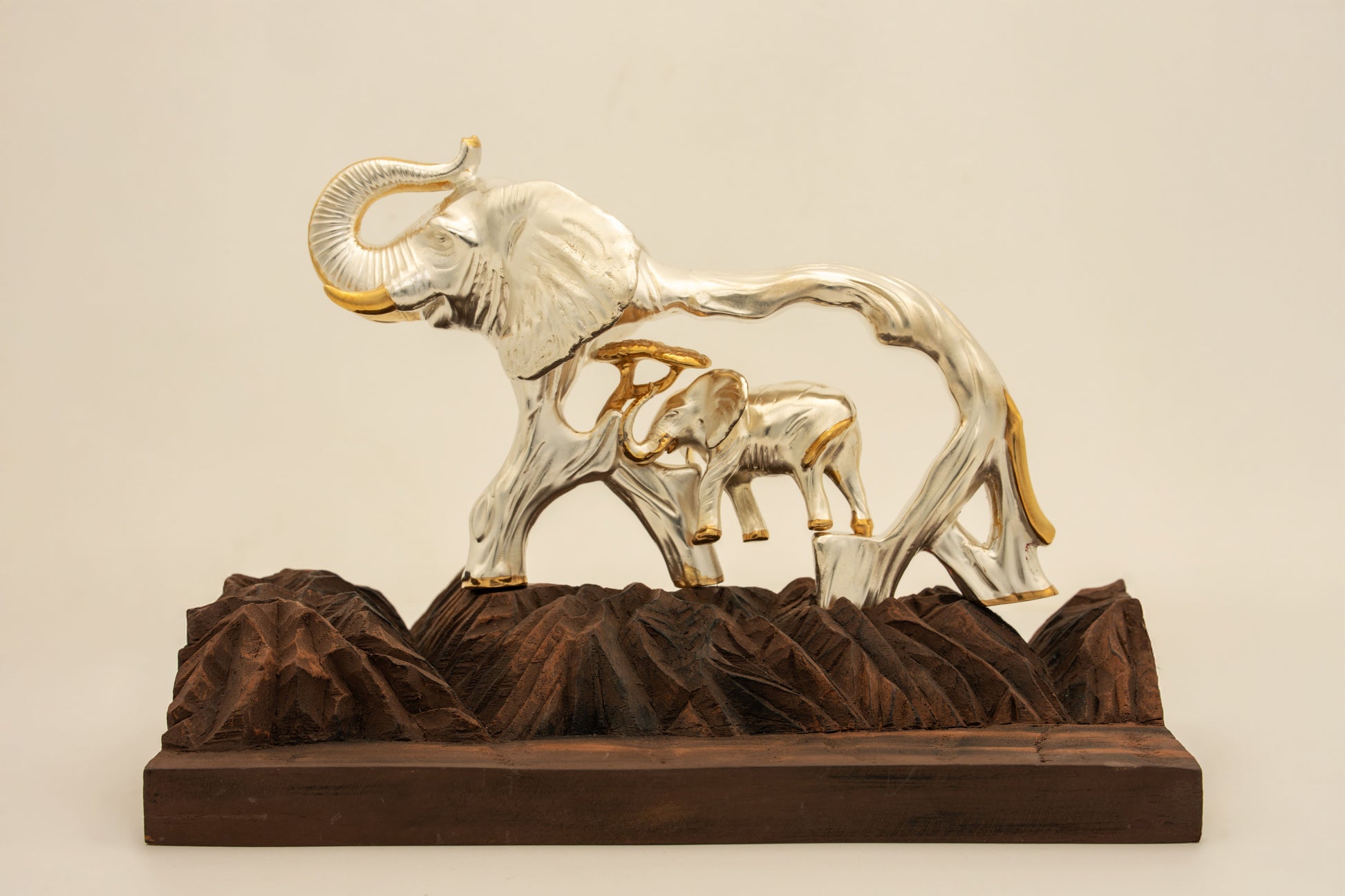 A symbol of strength and serenity, the Ethereal Elephant captures nature’s grace in sculptural form. Handcrafted with flowing contours and subtle golden accents, this statement piece blends organic artistry with timeless elegance. Resting on a textured base reminiscent of carved wood, it embodies balance, wisdom, and majesty — making it a striking addition to any living space or collector’s showcase.