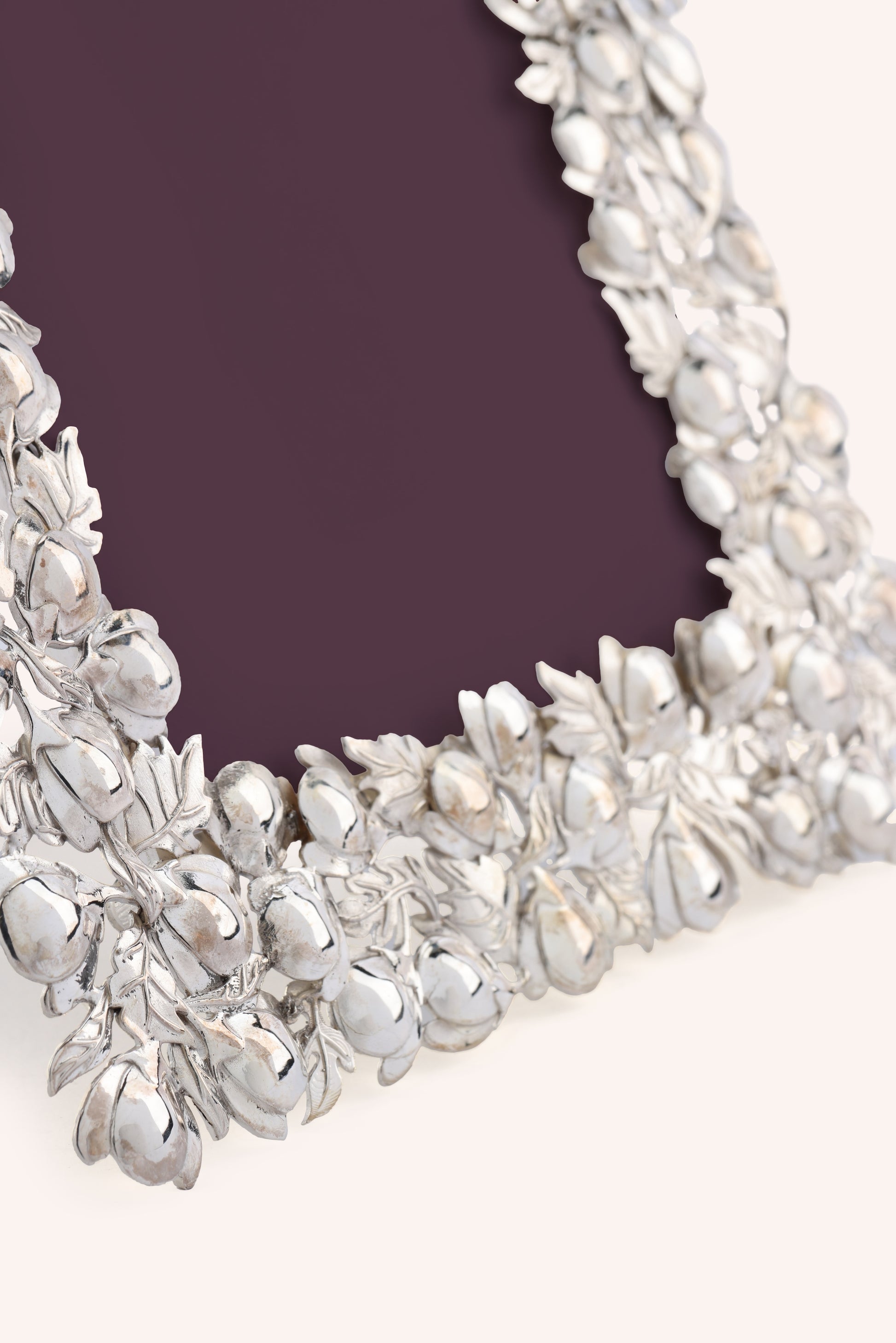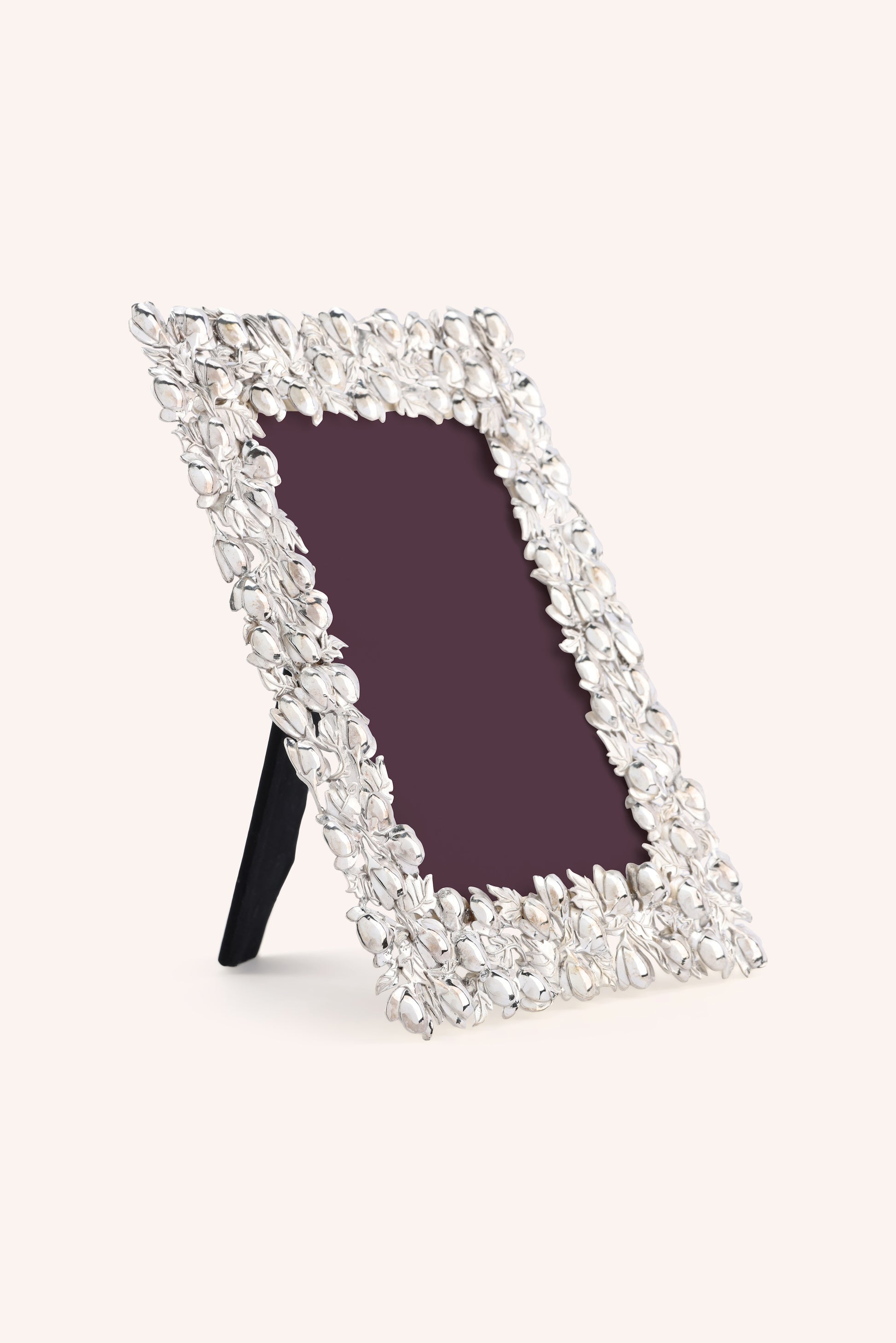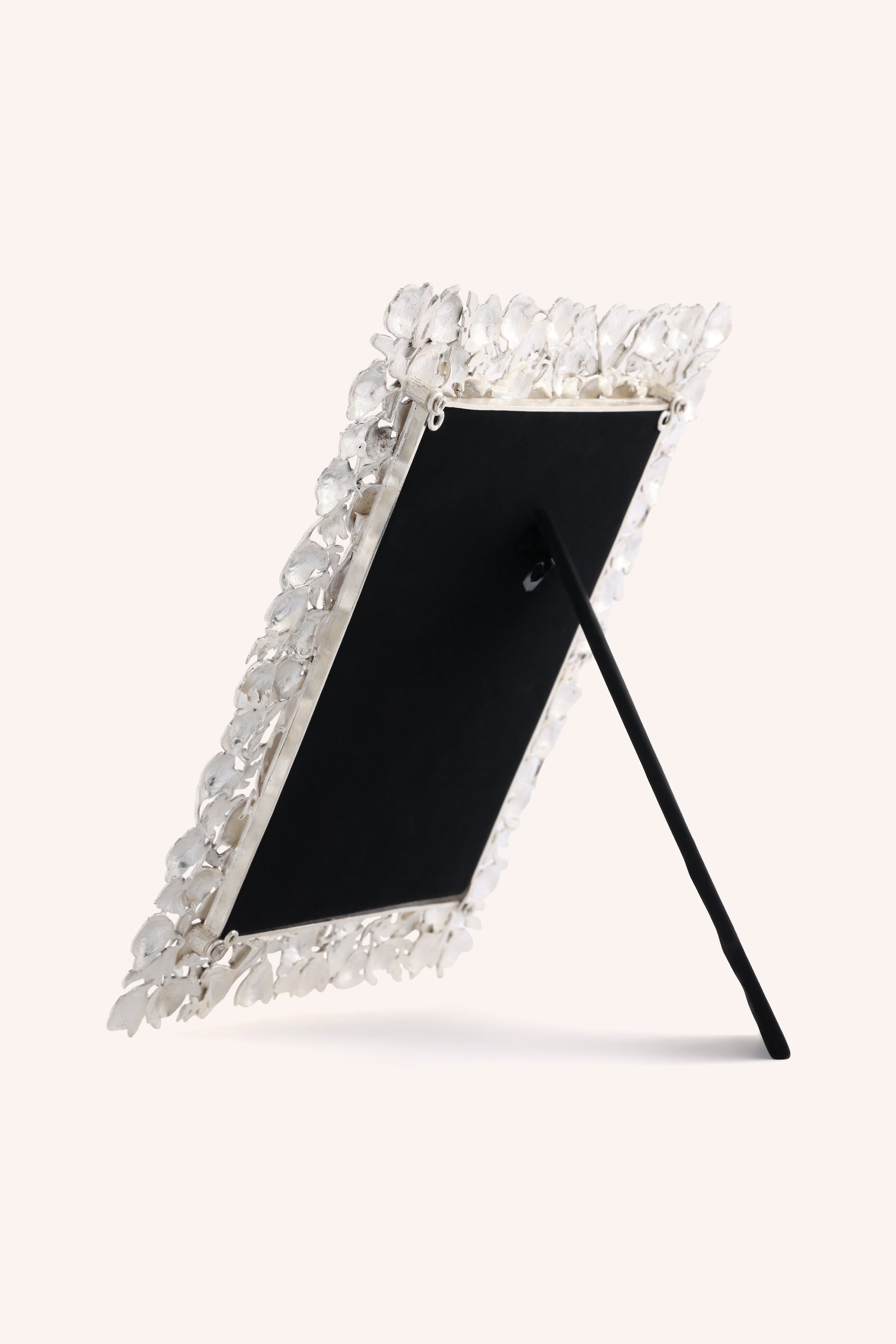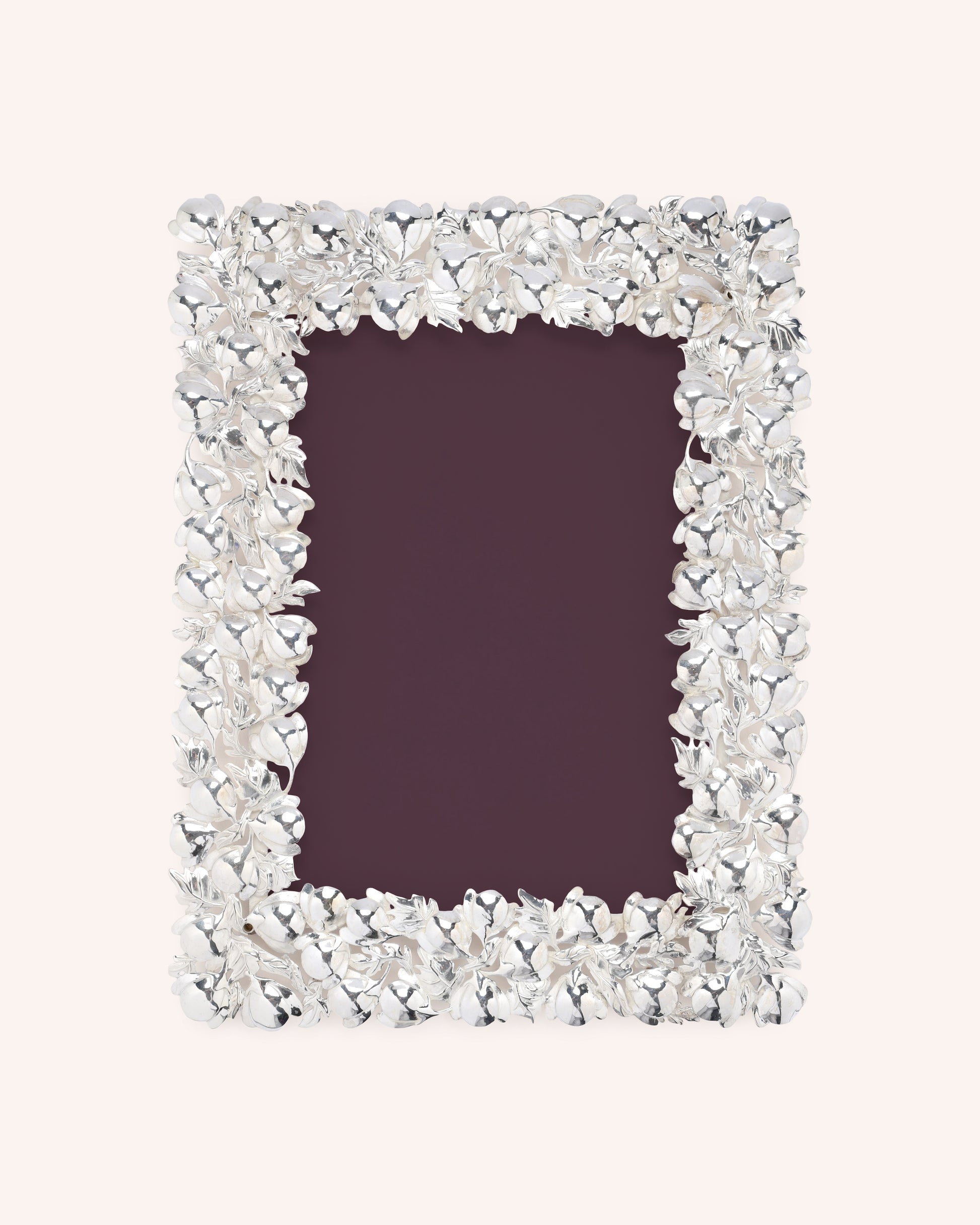 A silver bouquet of small flowers forms this elegant frame - soft, detailed, and full of life. Perfect for preserving memories that bloom with meaning.