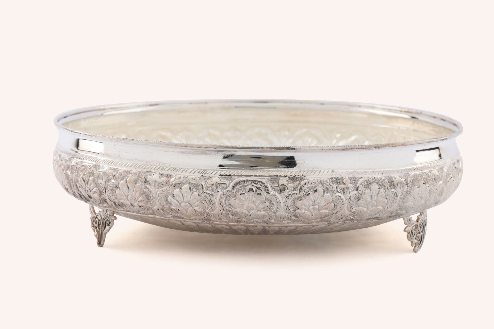 Hand-etched with dense floral nakshi detailing, this silver urli is a masterpiece of traditional craftsmanship. The ornate patterns flow seamlessly around the bowl, elevated by delicately carved feet. A symbol of heritage artistry, it is both functional and decorative, exuding quiet opulence.