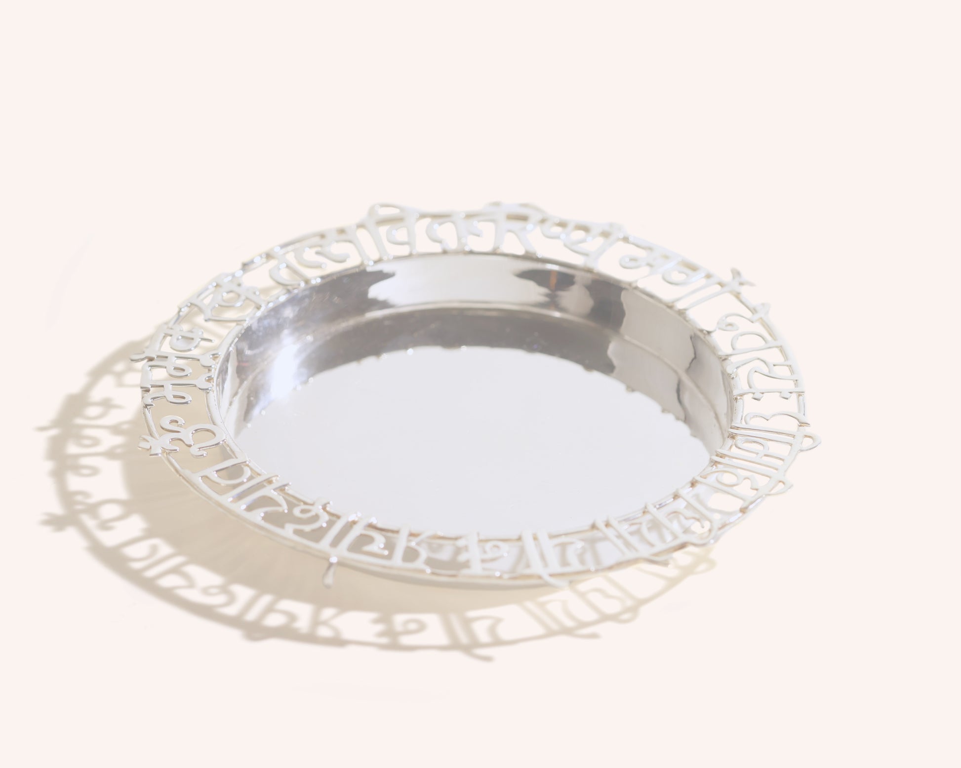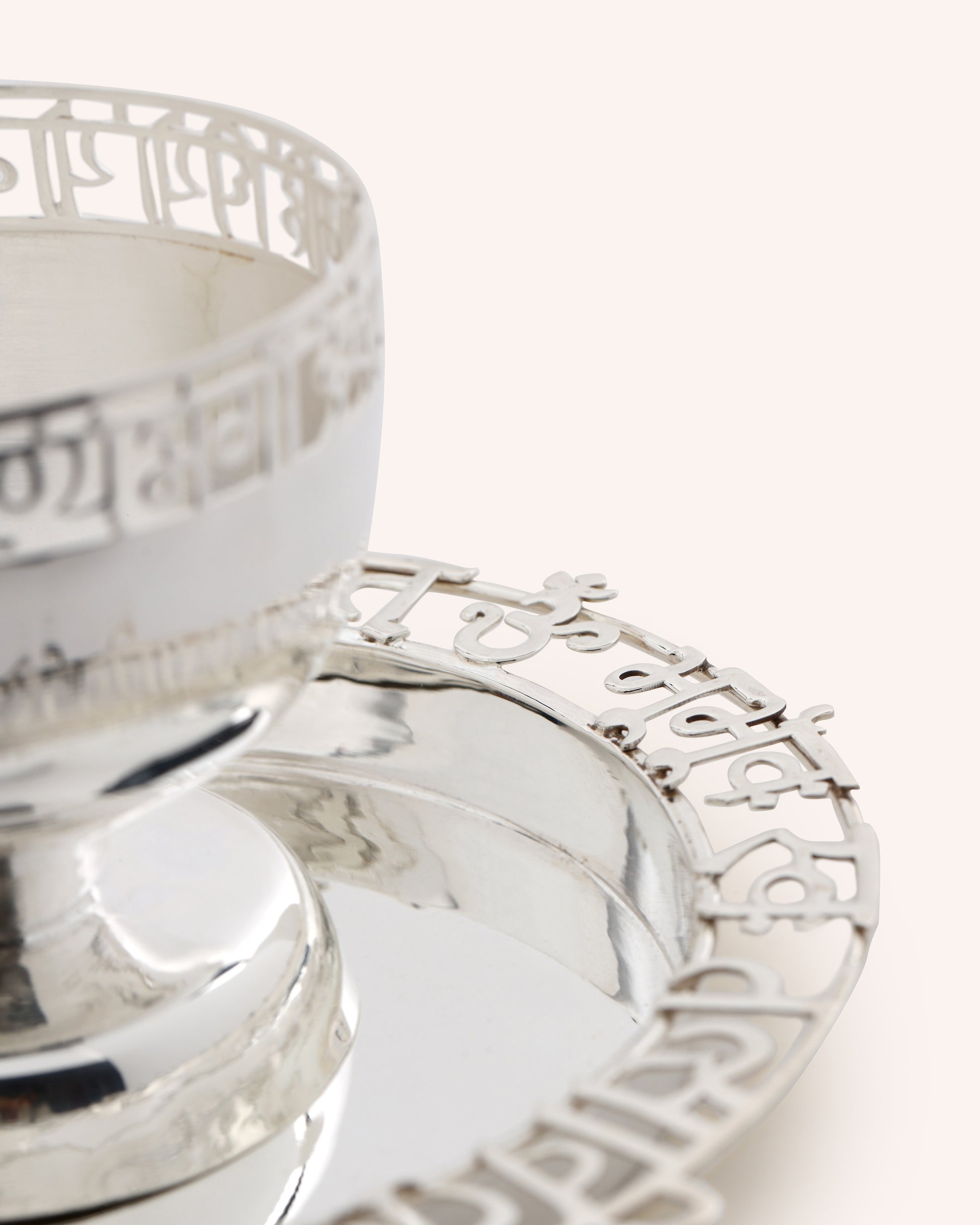 Sacred and powerful, the Gayatri Mantra Puja Thali Set is encircled with the revered mantra, embossed in silver filigree. Handcrafted in 92.5 sterling silver, the thali and diya together embody blessings of wisdom, purity, and divine protection. A spiritual keepsake as much as a ritual essential, it brings mantra energy into every puja.