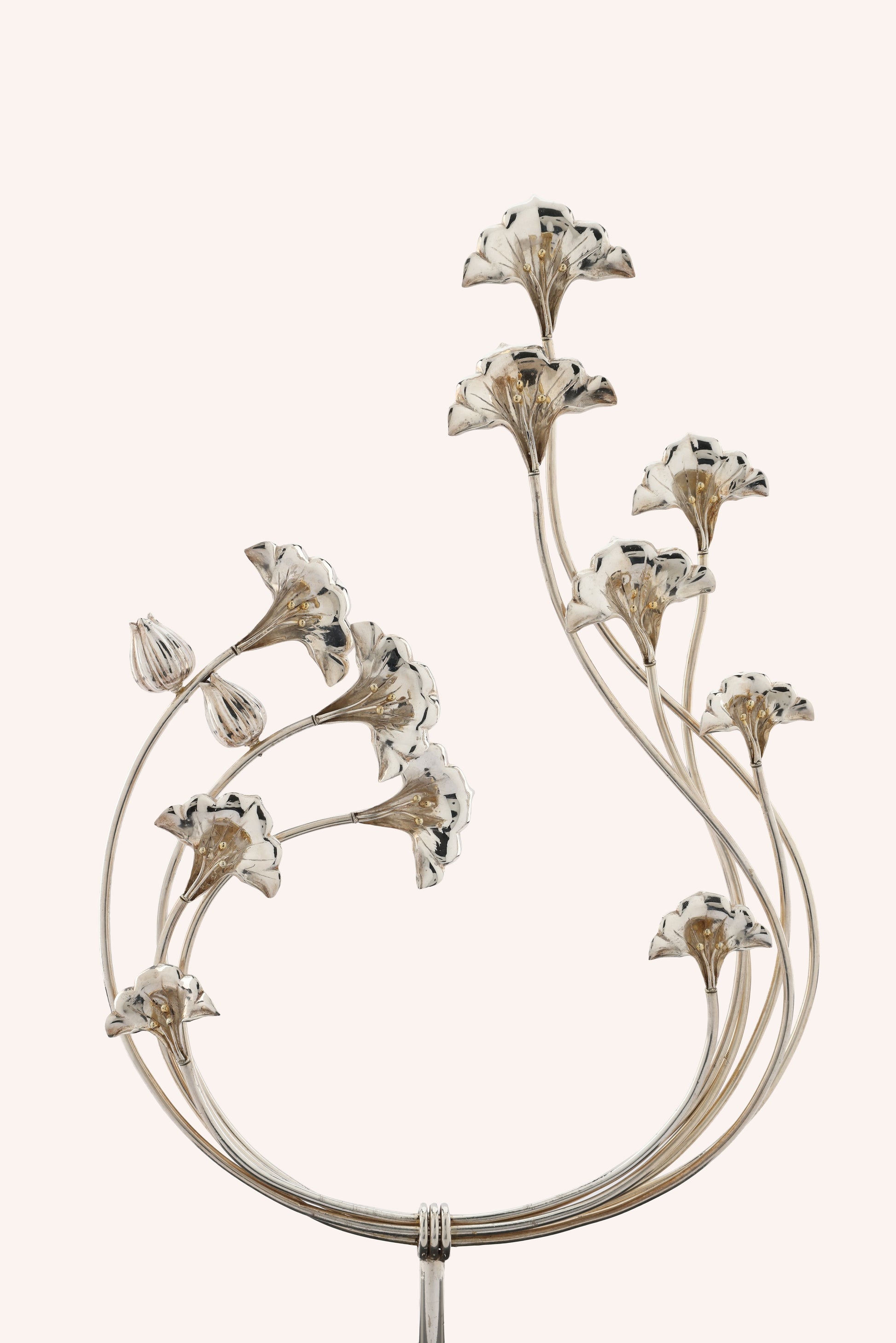 From the Ginkgo Collection, this centrepiece features silver stems unfurling into hand-sculpted ginkgo leaves with delicate golden highlights. Symbolising endurance and longevity, its flowing design embodies both strength and grace.