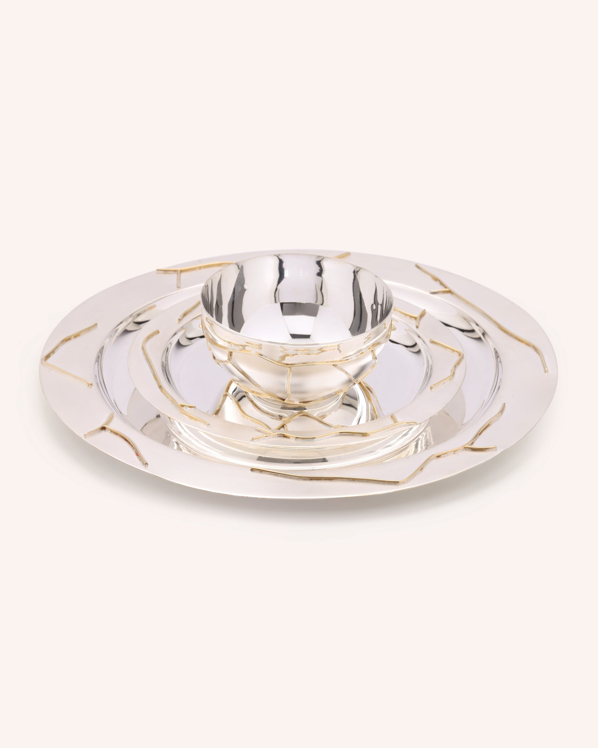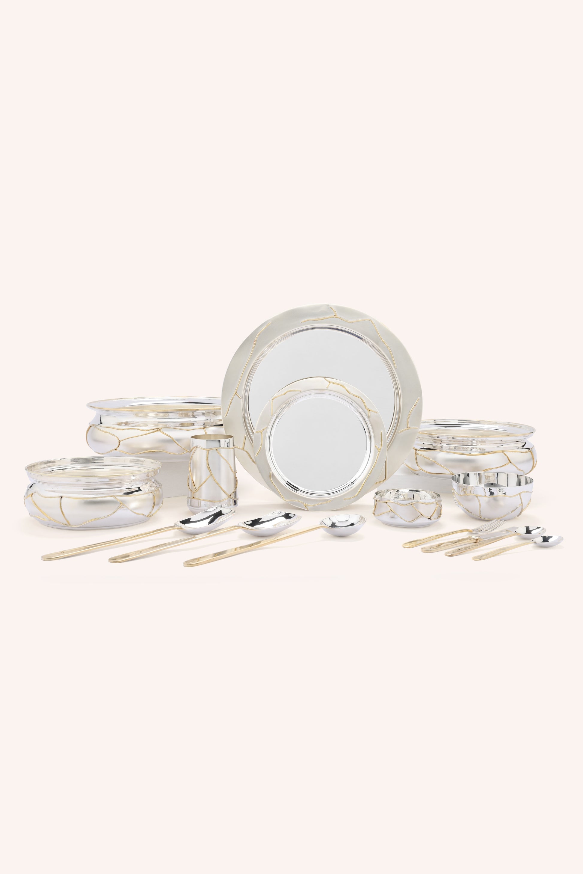 Inspired by the ancient Japanese art of Kintsugi, this dinner set celebrates the philosophy of finding beauty in imperfection. Handcrafted in 92.5 pure silver, each piece is adorned with flowing crack-like motifs, highlighted in delicate detail, symbolizing strength, renewal, and timeless elegance. More than serveware, the Kintsugi Dinner Set is an heirloom that tells stories of resilience and artistry at every table.