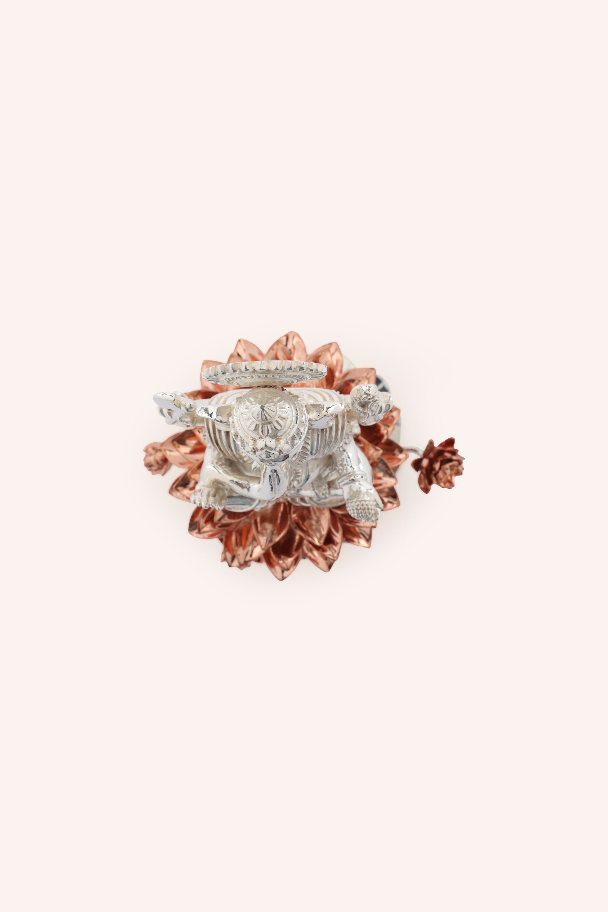 An exquisite handcrafted Lord Ganesha idol in 92.5 silver, seated gracefully on a blooming copper-toned lotus. Symbolising wisdom, prosperity, and auspicious beginnings, this piece blends divinity with fine artistry. The layered lotus pedestal and delicate floral detailing make it a statement of devotion and design. Perfect for puja altars and as an heirloom collectible.