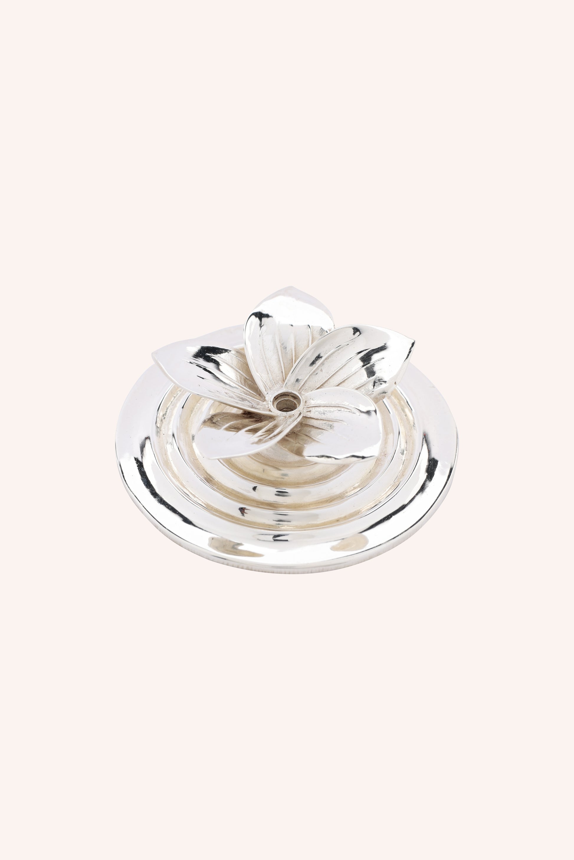 This silver lotus incense holder is designed with layered petals rising in bloom, cradling the incense stick at its centre. Representing purity and transcendence, it brings serenity to any pooja or meditation space.