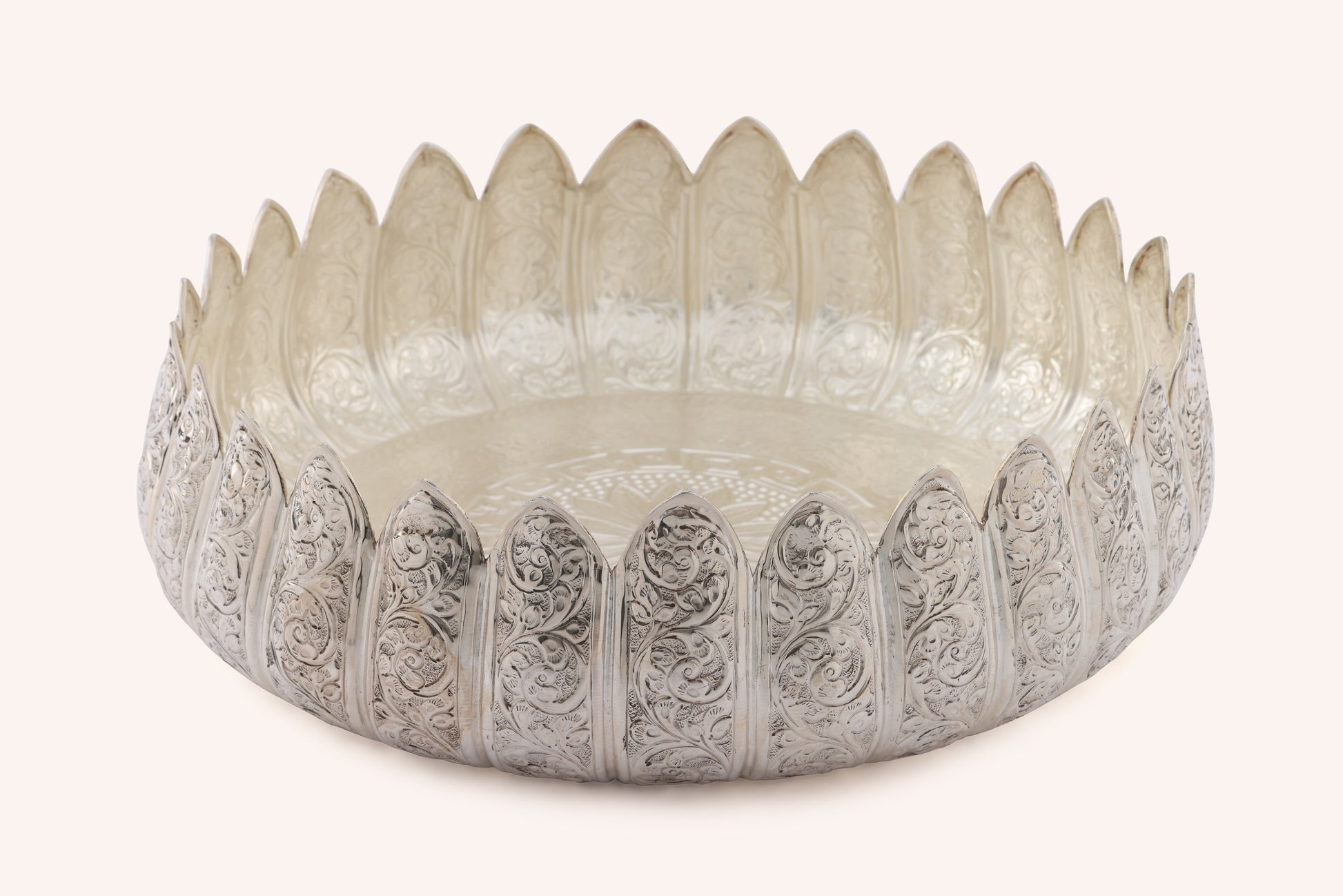 Inspired by the purity of the lotus, this handcrafted silver urli features petal-shaped panels with intricate nakshi engravings. Each petal is etched with fine scrollwork, creating depth and dimension. A symbol of beauty and divinity, this urli is perfect for floral arrangements or as a centrepiece that radiates timeless grace.