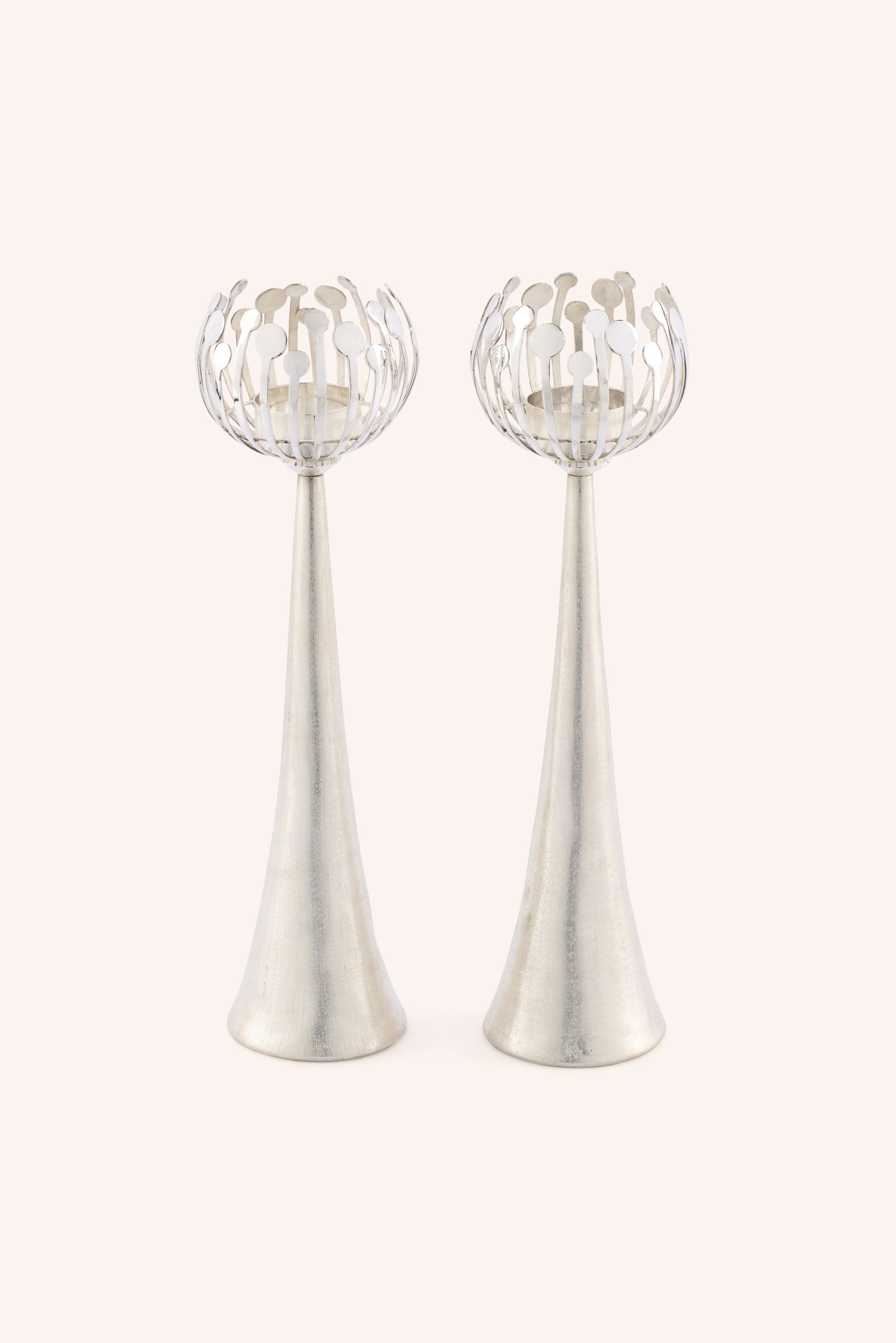 Sleek and modern in form, this candlestand takes inspiration from the lotus pod. The tall, tapered silver stem rises into an openwork crown that holds the candle with elegance. Its contemporary design celebrates simplicity while retaining the timeless essence of silver craftsmanship.