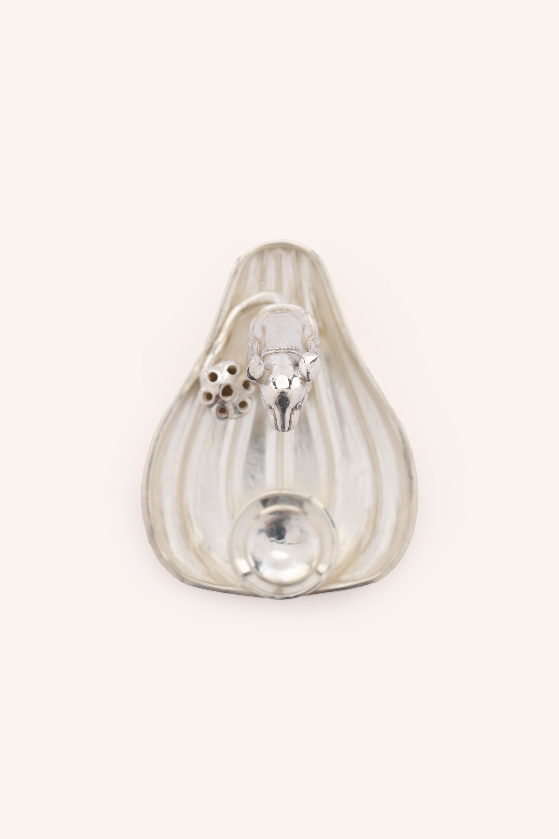 Handcrafted in 92.5 sterling silver, this creation depicts Lord Ganesha’s vahana, the Mooshak, standing in devotion with folded hands beside a diya and offering vessel. Symbolising humility and service, it is a beautiful expression of bhakti, perfect for festive rituals or as a sacred collectible.