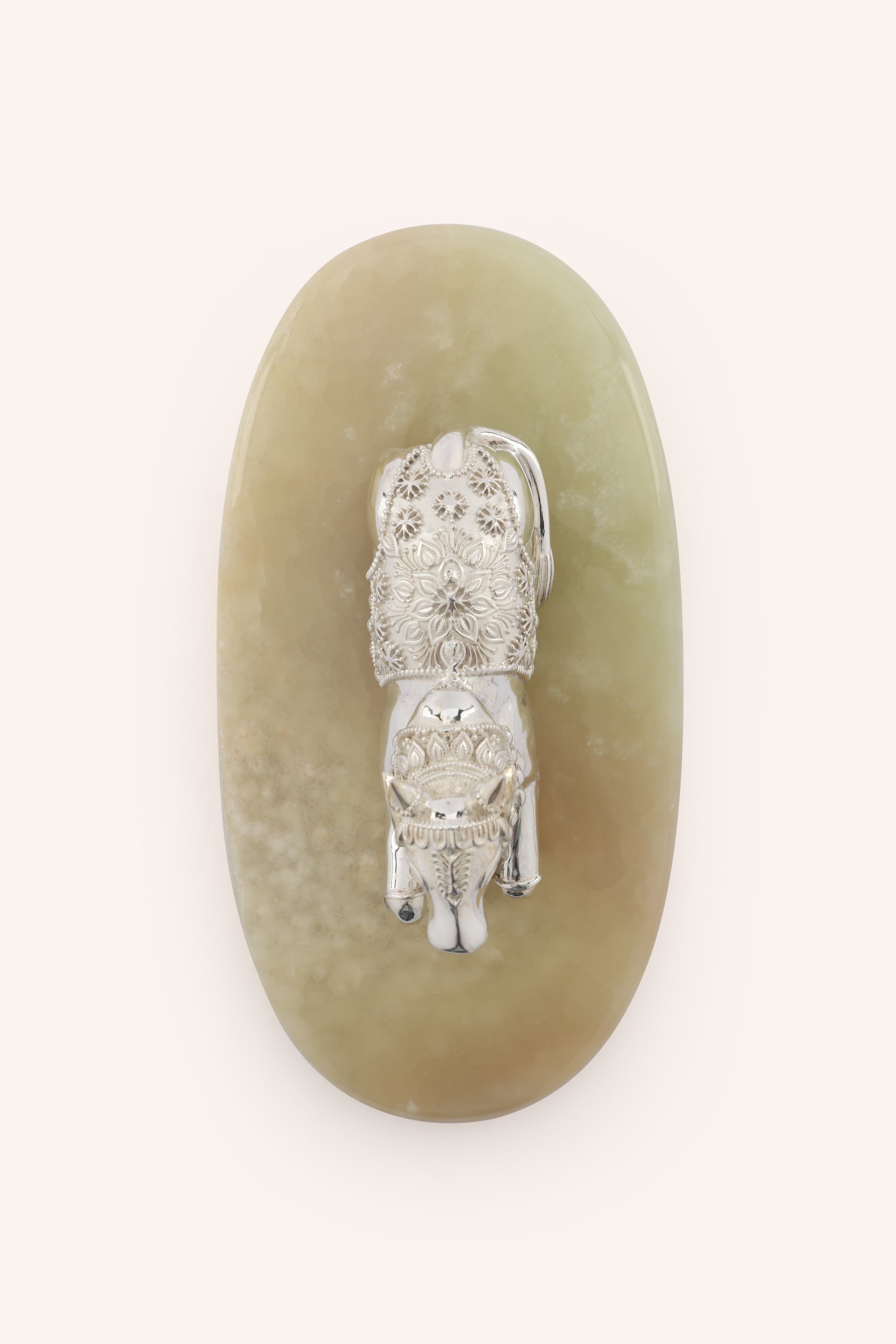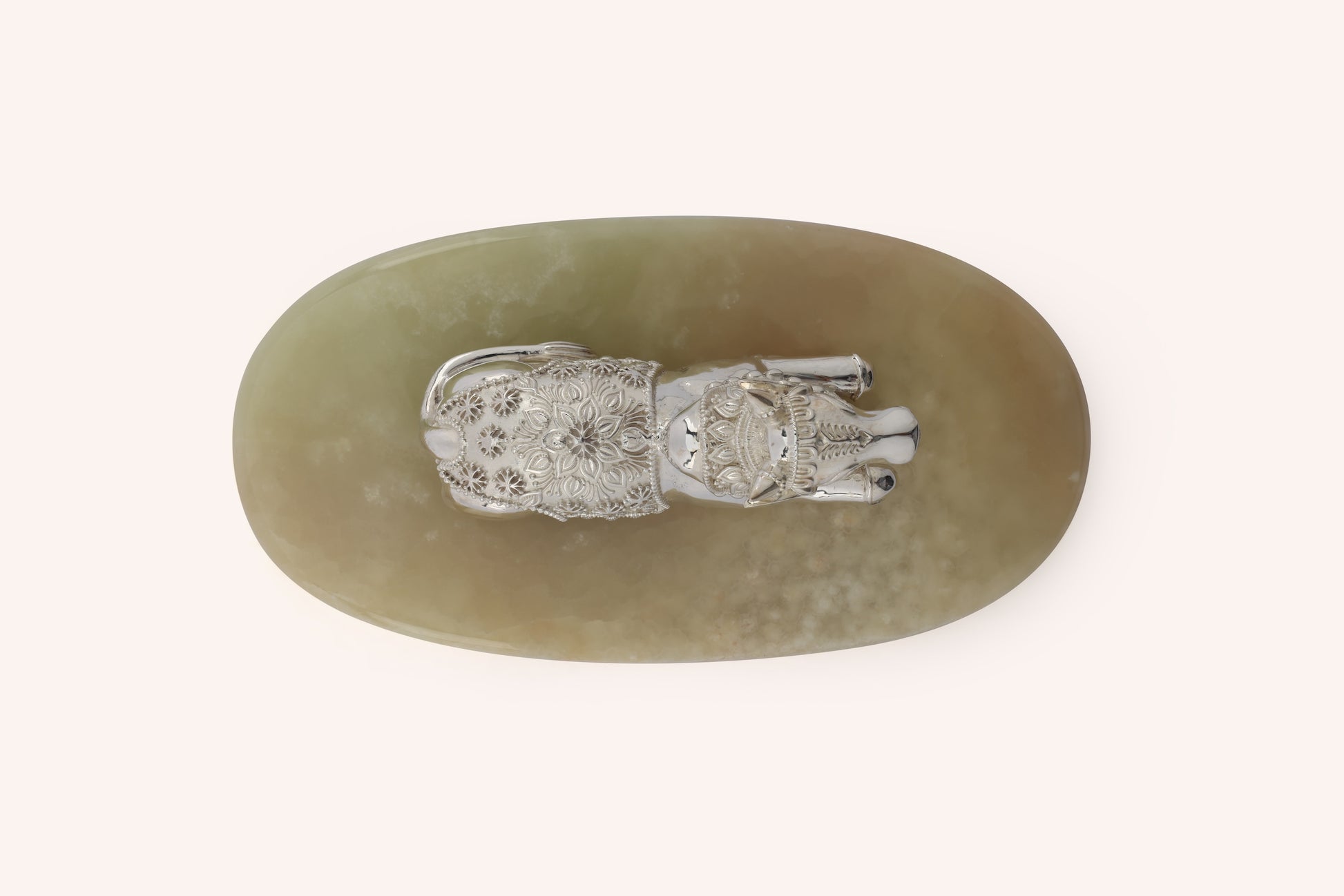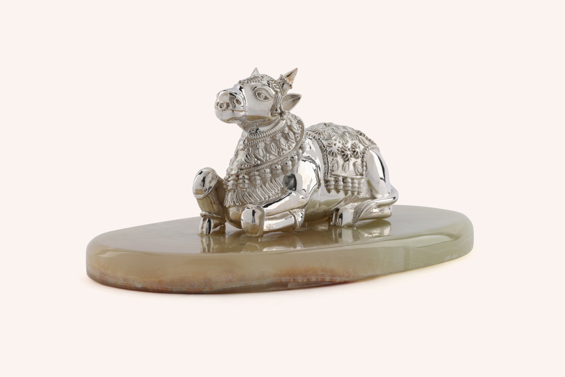 An exquisitely detailed silver Nandi, seated in calm devotion on a polished onyx base. Symbolising loyalty, patience, and strength, this sacred vahana of Lord Shiva carries intricate ornamental work, making it both spiritual and artistic.