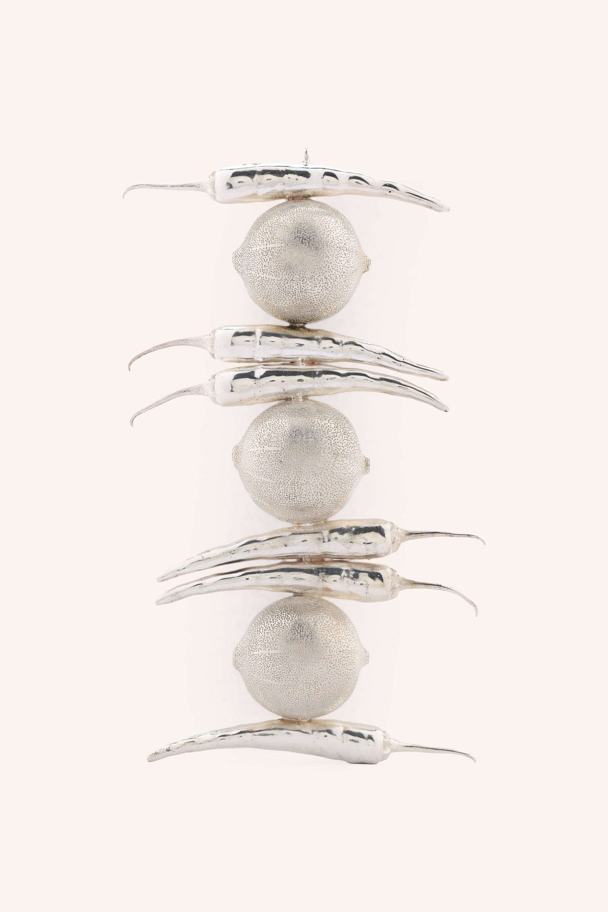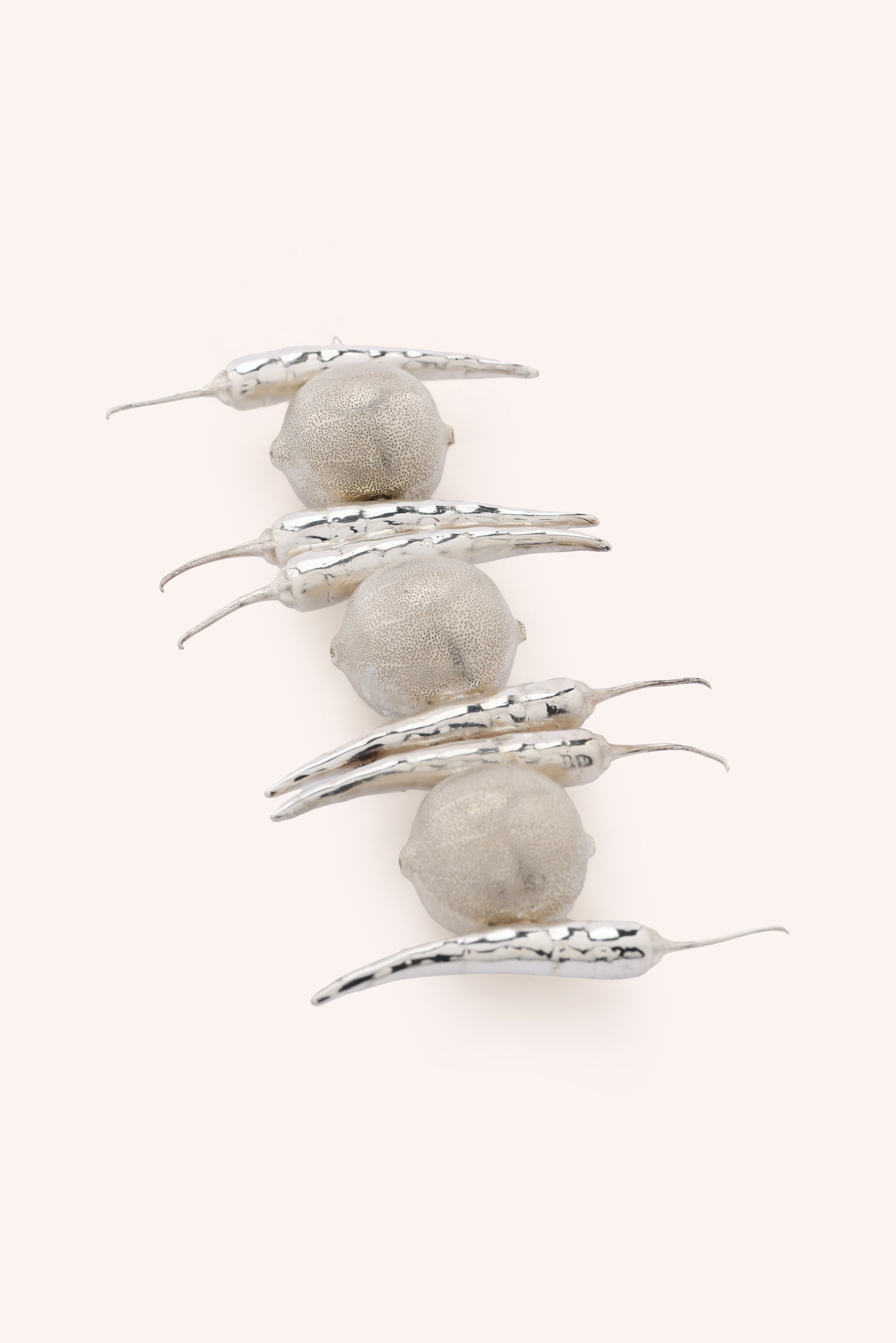 An artistic take on the traditional protective charm, this silver Nimbu Mirchi is sculpted with lifelike lemons and chillies stacked in sequence. Rooted in folklore to ward off negativity, it transforms a humble talisman into a luxury keepsake.