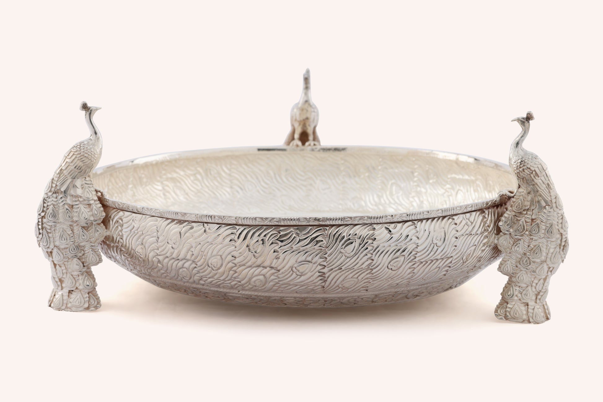 This exquisite urli is adorned with three sculpted peacocks, symbolising prosperity and grandeur. The bowl itself is hand-engraved with feather-like textures, echoing the bird’s natural elegance. A rare fusion of artistry and symbolism, the Peacock Silver Urli turns any space into a celebration of beauty and abundance.