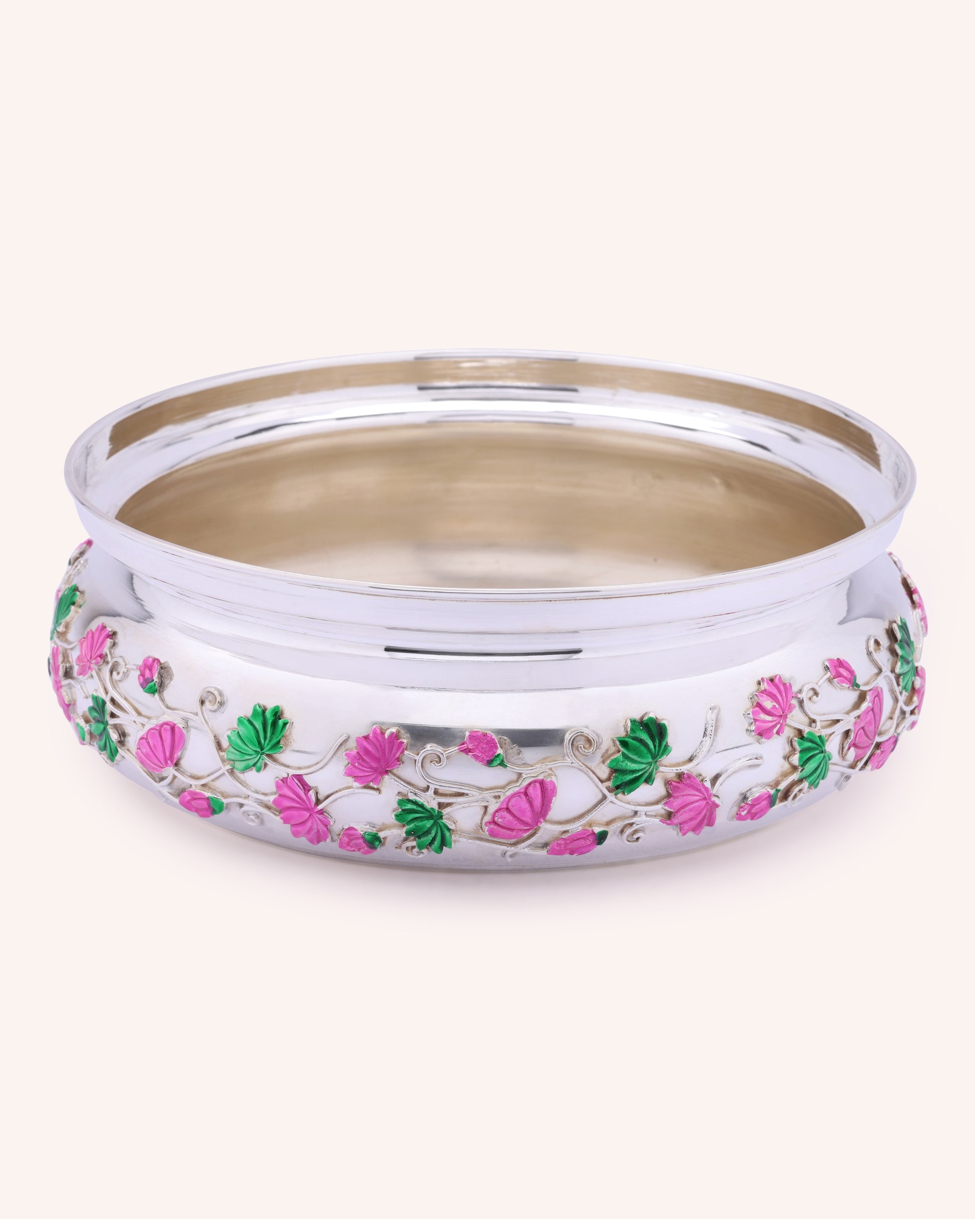 An heirloom in its own right, this handcrafted silver serving bowl from the Pichwai Dinner Set carries the timeless detailing of Nathdwara’s Pichwai paintings. Perfect for festive gatherings and family meals, it embodies cultural richness while offering utility at scale.