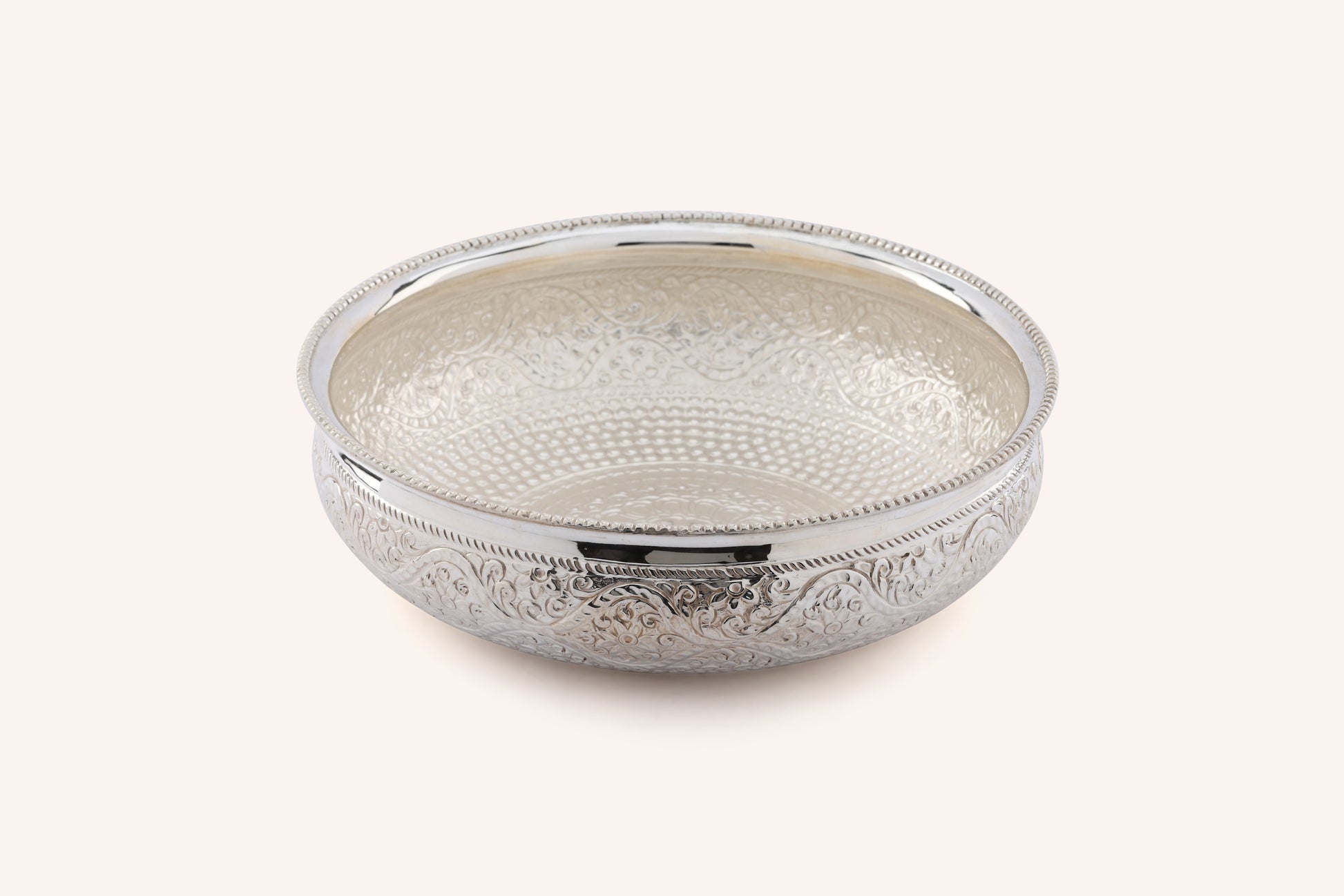 Hand-etched with dense floral nakshi detailing, this silver urli is a masterpiece of traditional craftsmanship. The ornate patterns flow seamlessly around the bowl, elevated by delicately carved feet. A symbol of heritage artistry, it is both functional and decorative, exuding quiet opulence.