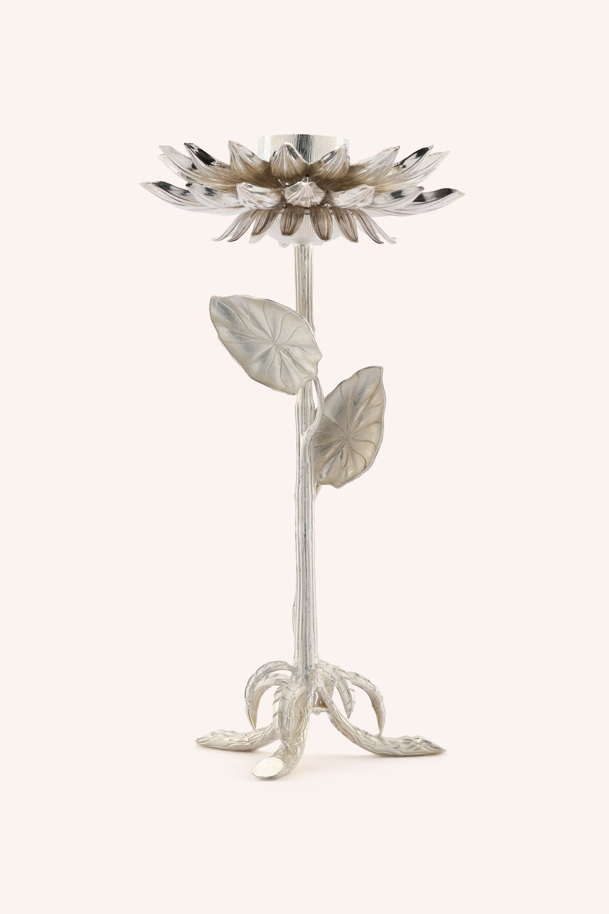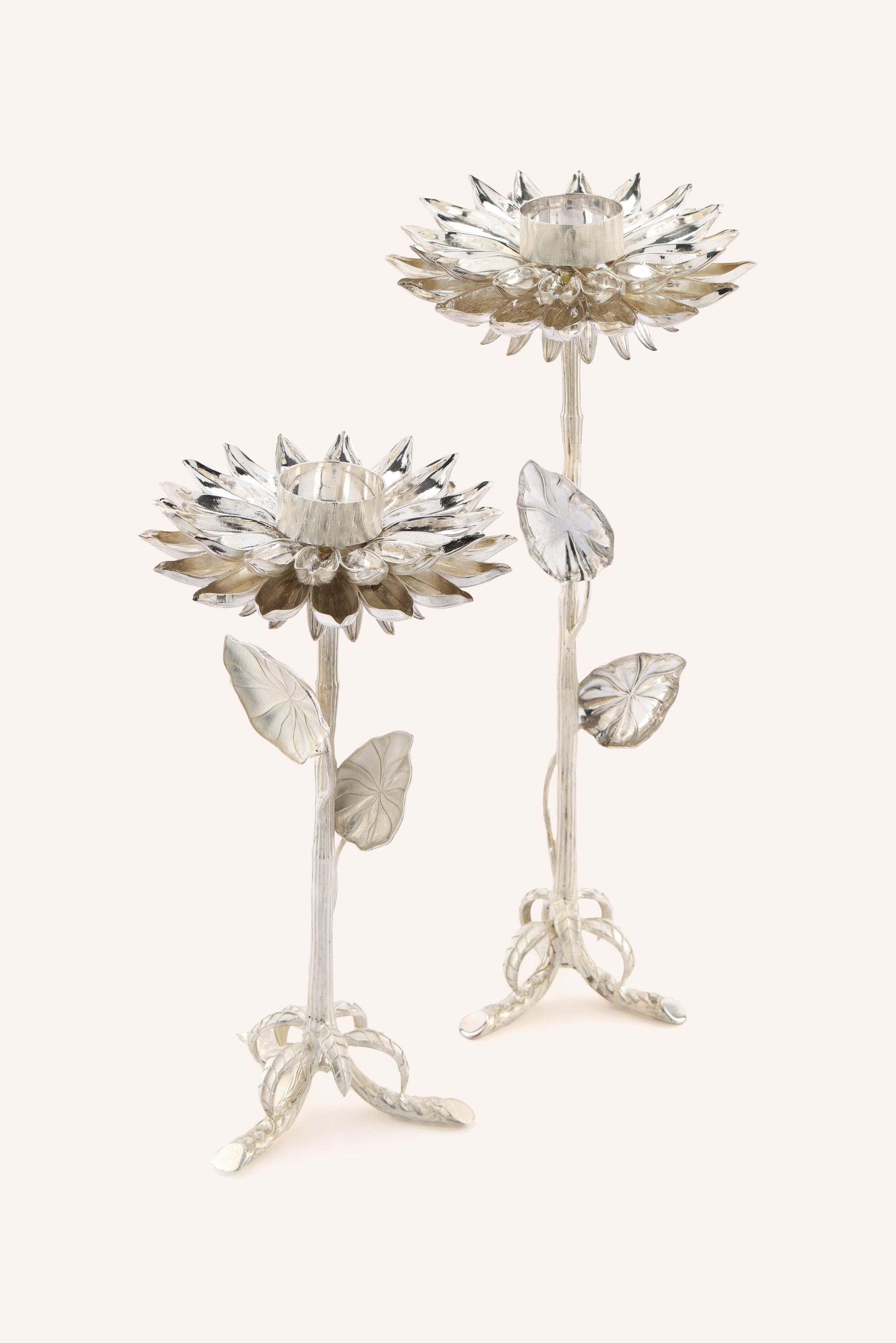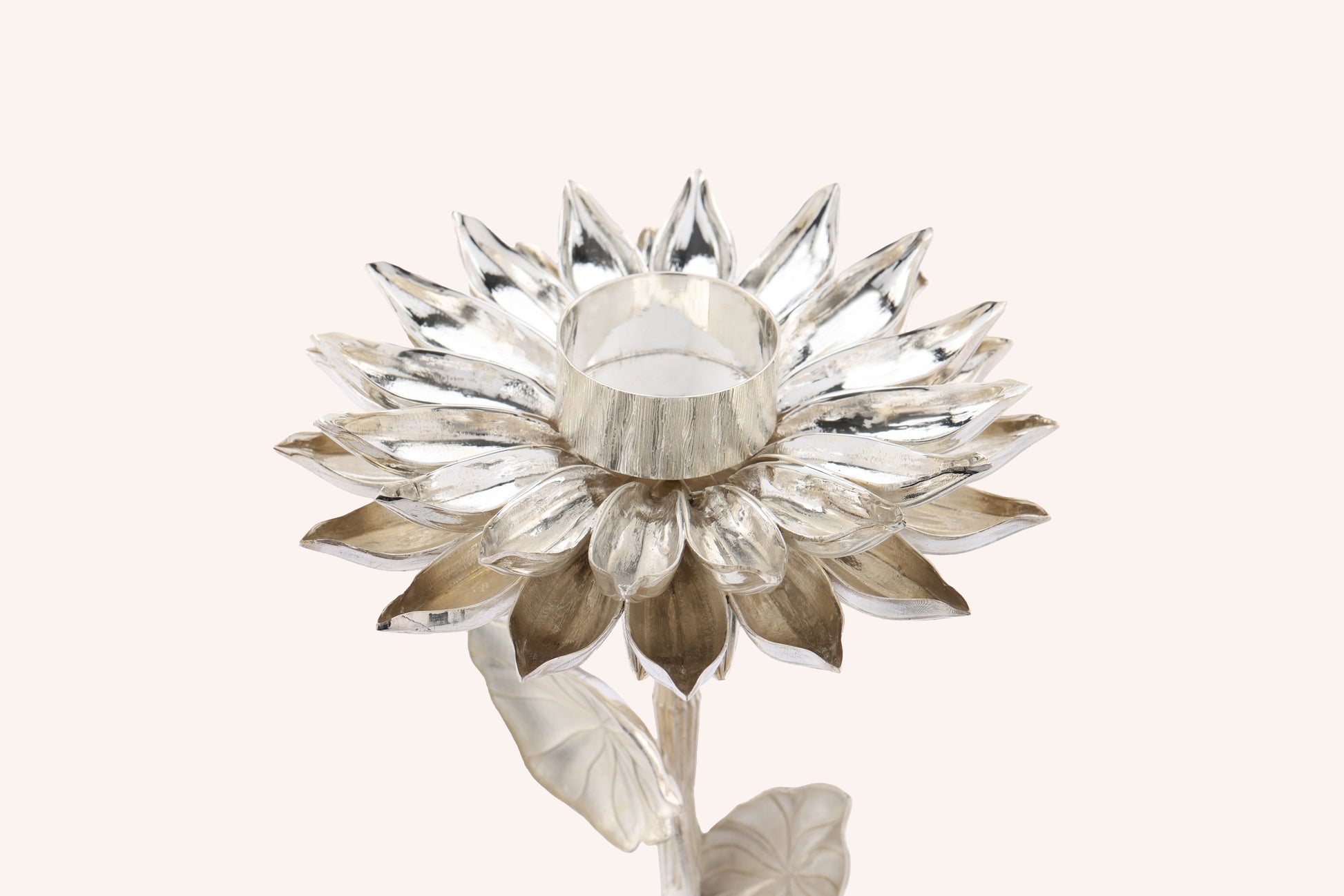 Inspired by the grandeur of sunflowers, this candlestand is adorned with layered silver petals and naturalistic leaves curling around its stem. The textured detailing captures the vibrancy of nature, while the wide bloom holds the candle in luminous grace. A pair of these creates a powerful statement of heritage and artistry.